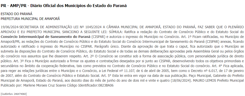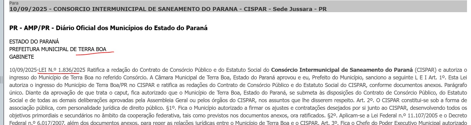 Nesta seção é possível consultar as Leis de Ratificação dos Municípios que integram o Consórcio Público Intermunicipal de Saneamento do Paraná (CISPAR).